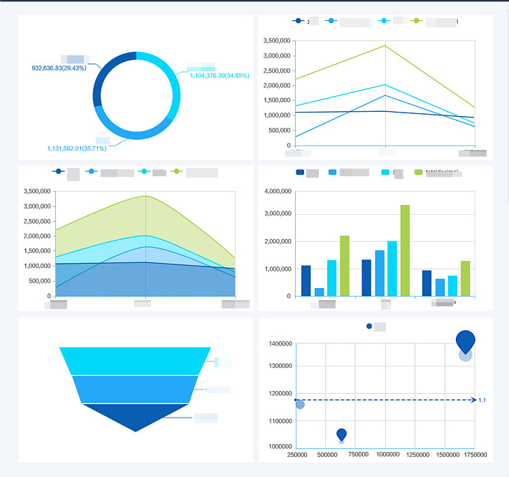 生成獨立一張圖界面,將所有的數(shù)據(jù)已折線、餅圖、柱狀圖、區(qū)域圖、數(shù)字等進行可視化展示。
