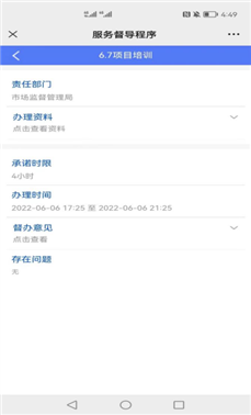 3、展示字段:責(zé)任部門、承諾時(shí)限、辦理進(jìn)度(辦理中、已完成、已逾期)、辦理材料、存在問題、催辦意見(職級(jí)高的可看到下級(jí)的督辦意見和回復(fù)情況,可二次回復(fù));