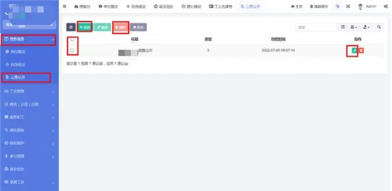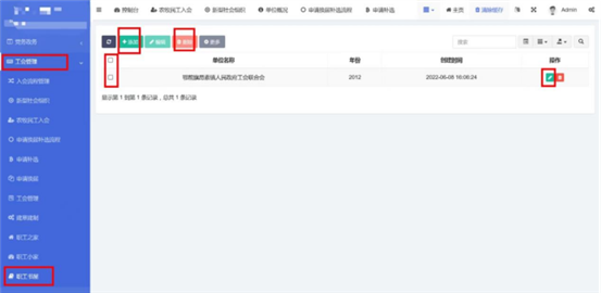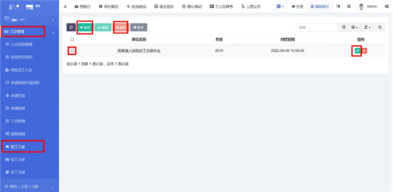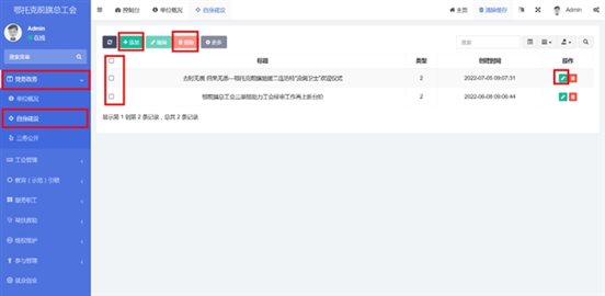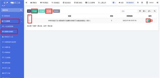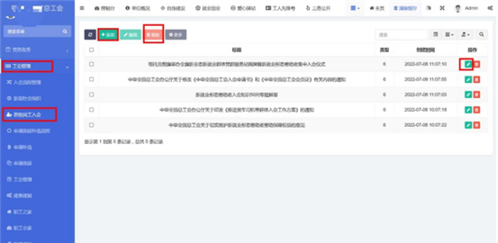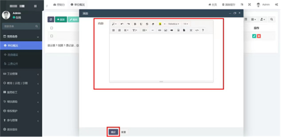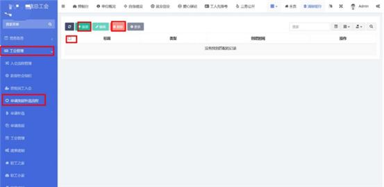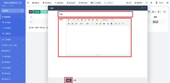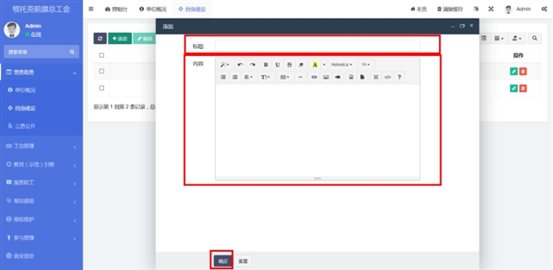 在工會(huì)管理-》新型社會(huì)組織中查看已錄入的新型社會(huì)組織。點(diǎn)擊添加按鈕,輸入標(biāo)題和內(nèi)容。內(nèi)容編輯器中支持文字排版、上傳圖片、插入視頻鏈接、插入表格、給文字加超鏈接等功能。點(diǎn)擊確定按鈕保存內(nèi)容,發(fā)布到前端。點(diǎn)擊編輯按鈕,編輯之前發(fā)布的內(nèi)容后點(diǎn)擊確定按鈕保存內(nèi)容,發(fā)布到前端。支持批量刪除,勾選想要?jiǎng)h除的信息,點(diǎn)擊上方按鈕中的刪除按鈕。