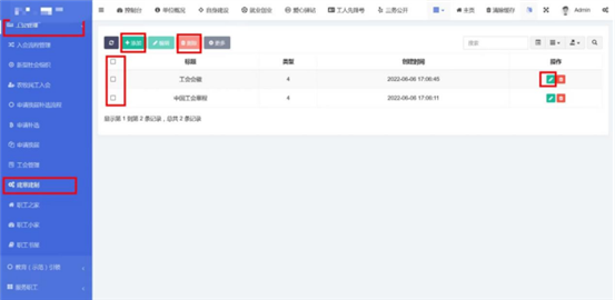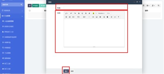在工會(huì)管理-》農(nóng)牧民工入會(huì)中查看已錄入的農(nóng)牧民工入會(huì)信息。點(diǎn)擊添加按鈕,輸入標(biāo)題和內(nèi)容。內(nèi)容編輯器中支持文字排版、上傳圖片、插入視頻鏈接、插入表格、給文字加超鏈接等功能。點(diǎn)擊確定按鈕保存內(nèi)容,發(fā)布到前端。點(diǎn)擊編輯按鈕,編輯之前發(fā)布的內(nèi)容后點(diǎn)擊確定按鈕保存內(nèi)容,發(fā)布到前端。支持批量刪除,勾選想要?jiǎng)h除的信息,點(diǎn)擊上方按鈕中的刪除按鈕。