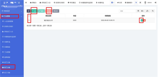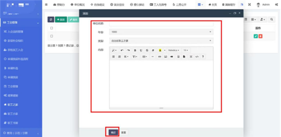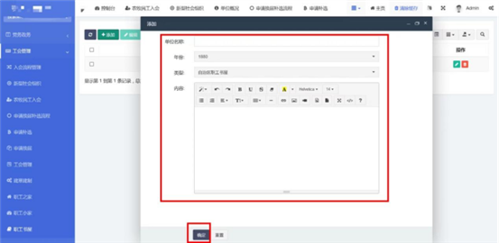 在工會(huì)管理-》職工書屋中查看已錄入的職工書屋信息。點(diǎn)擊添加按鈕,輸入單位名稱,選擇年份,選擇職工書屋類型,輸入內(nèi)容。內(nèi)容編輯器中支持文字排版、上傳圖片、插入視頻鏈接、插入表格、給文字加超鏈接等功能。點(diǎn)擊確定按鈕保存內(nèi)容,發(fā)布到前端。點(diǎn)擊編輯按鈕,編輯之前發(fā)布的內(nèi)容后點(diǎn)擊確定按鈕保存內(nèi)容,發(fā)布到前端。支持批量刪除,勾選想要?jiǎng)h除的信息,點(diǎn)擊上方按鈕中的刪除按鈕。
